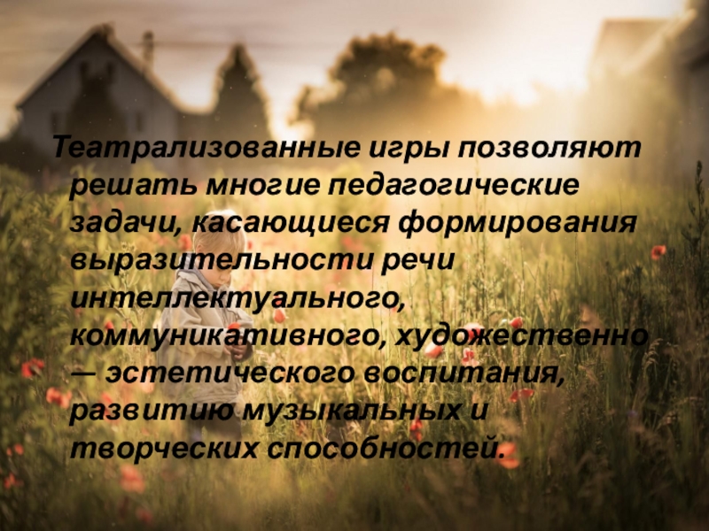 Слайд 3 Театрализованные игры позволяют решать многие педагогические задачи, касающиеся формирования выразительности речи