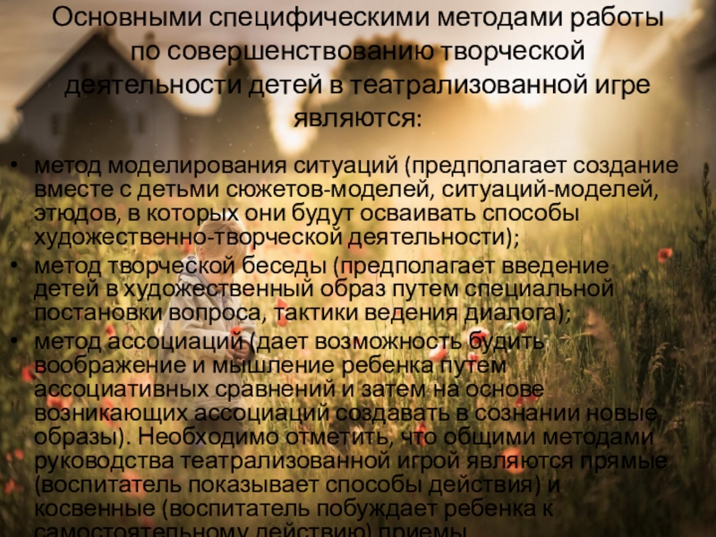 Слайд 11Основными специфическими методами работы по совершенствованию творческой деятельности детей в театрализованной