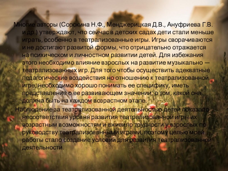 что сейчас в детских садах дети стали меньше играть, особенно в театрализованные игры. Игры сворачиваются и не достигают развитой формы, что отрицательно отражается на психическом и личностном развитии детей. Для избежания этого необходимо влияние взрослых на развитие музыкально — театрализованных игр. Для того чтобы осуществить адекватные педагогические воздействия но отношению к театрализованной игре, необходимо хорошо понимать ее специфику, иметь представление о ее развивающем значении, о том, какой она должна быть на каждом возрастном этапе.