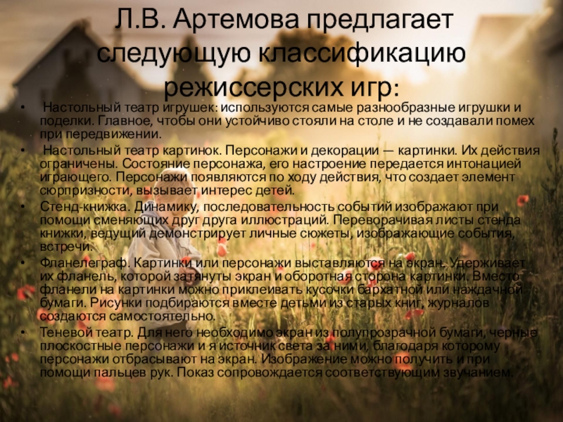 Слайд 9 Л.В. Артемова предлагает следующую классификацию режиссерских игр:
