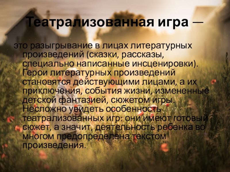 инсценировки). Герои литературных произведений становятся действующими лицами, а их приключения, события жизни, измененные детской фантазией, сюжетом игры. Несложно увидеть особенность театрализованных игр: они имеют готовый сюжет, а значит, деятельность ребенка во многом предопределена текстом произведения.