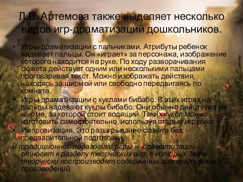 Слайд 10Л.В. Артемова также выделяет несколько видов игр-драматизаций дошкольников.