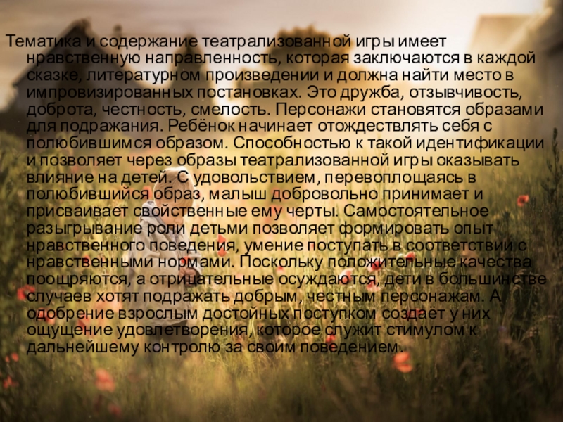 Слайд 6Тематика и содержание театрализованной игры имеет нравственную направленность, которая заключаются в