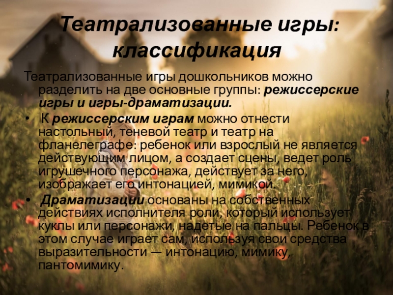В традиционной педагогике игры — драматизации относят к разделу творческих игр, в которых дети творчески воспроизводят содержание литературных произведений.