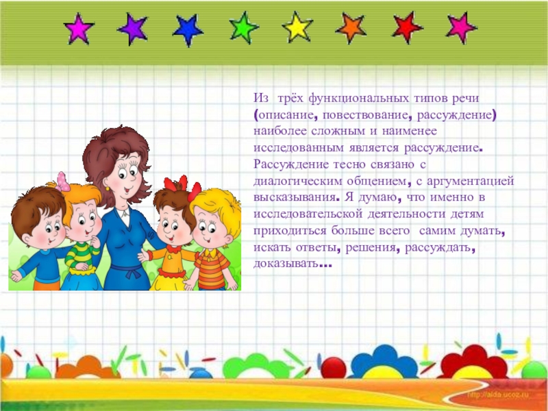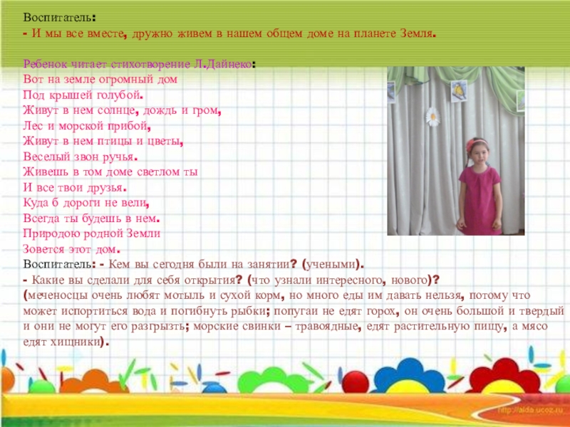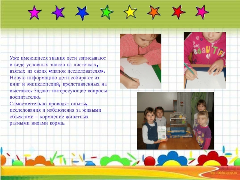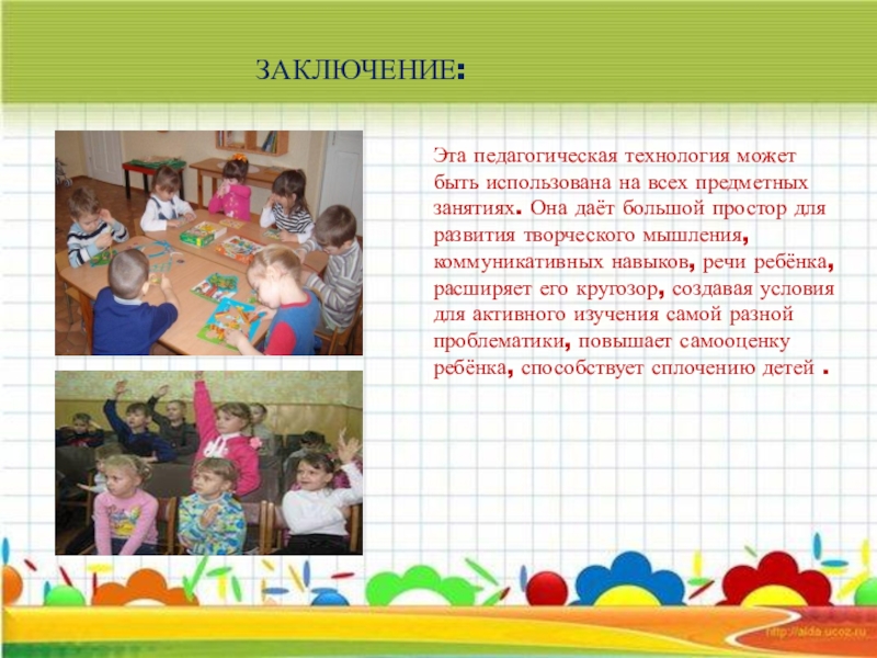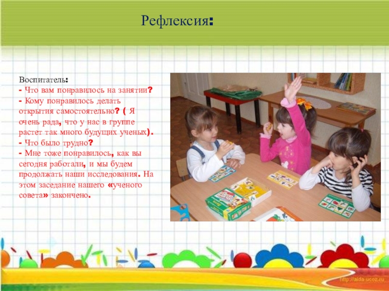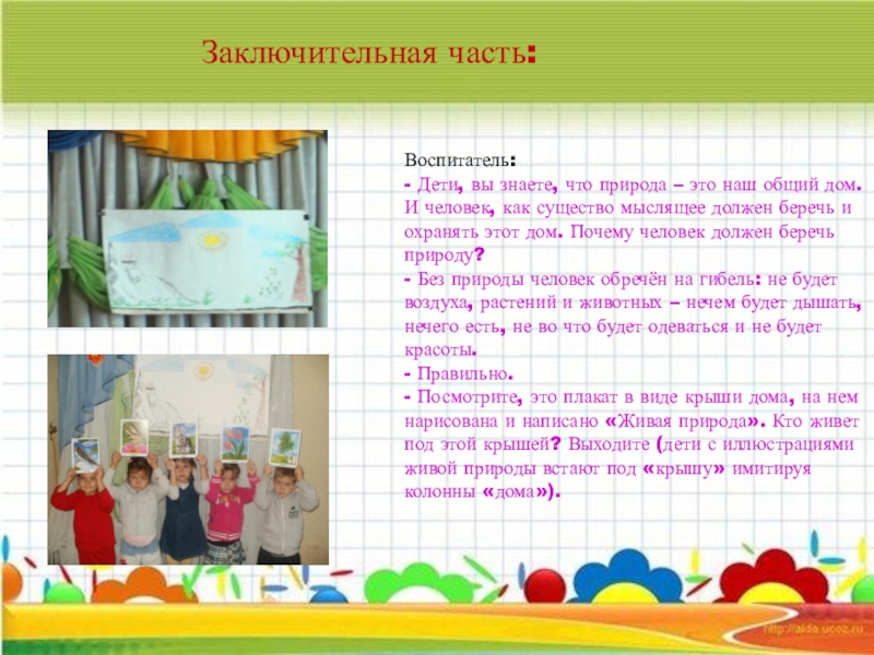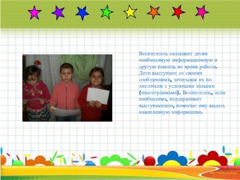 Когда от каждой подгруппы выступят несколько человек, воспитатель благодарит детей за хорошую работу и интересные сообщения.