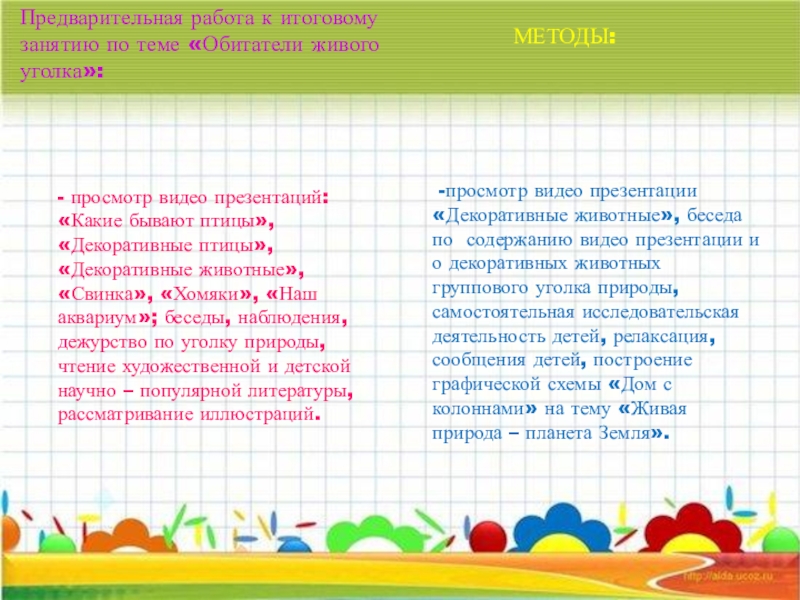 - просмотр видео презентаций: «Какие бывают птицы», «Декоративные птицы», «Декоративные животные», «Свинка», «Хомяки», «Наш аквариум»; беседы, наблюдения, дежурство по уголку природы, чтение художественной и детской научно – популярной литературы, рассматривание иллюстраций.