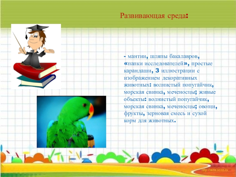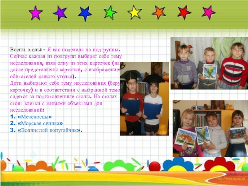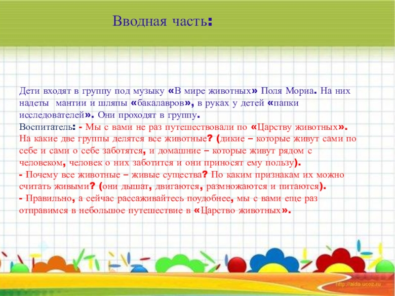 Дети входят в группу под музыку «В мире животных» Поля Мориа. На них надеты мантии и шляпы «бакалавров», в руках у детей «папки исследователей». Они проходят в группу.