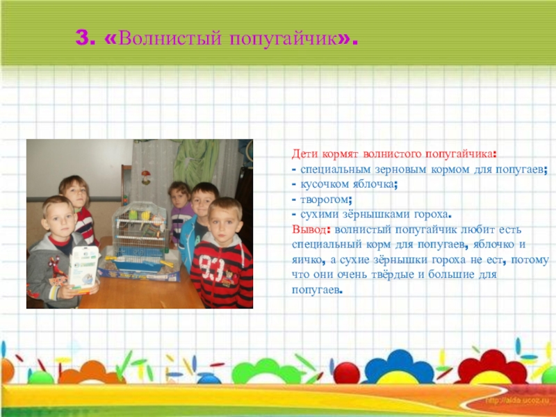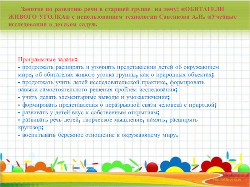 - продолжать расширять и уточнять представления детей об окружающем мире, об обитателях живого уголка группы, как о природных объектах;