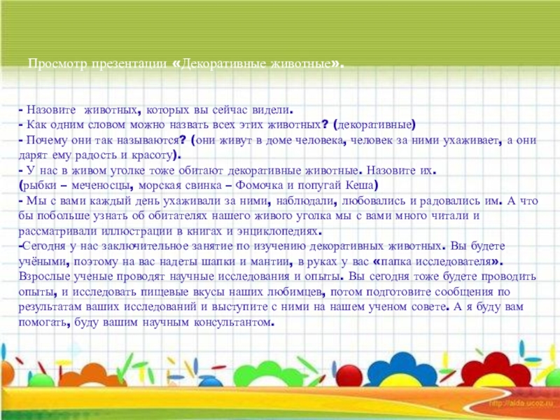 Предварительная работа к итоговому занятию по теме «Обитатели живого уголка»: