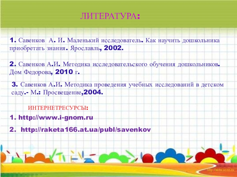 1. Савенков А. И. Маленький исследователь. Как научить дошкольника приобретать знания. Ярославль, 2002.