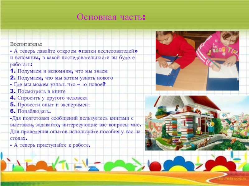 - продолжать учить детей исследовательской практике, формировать навыки самостоятельного решения проблем исследования;