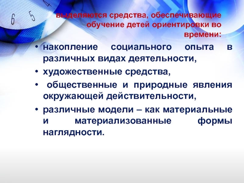 Слайд 10выделяются средства, обеспечивающие обучение детей ориентировки во времени: