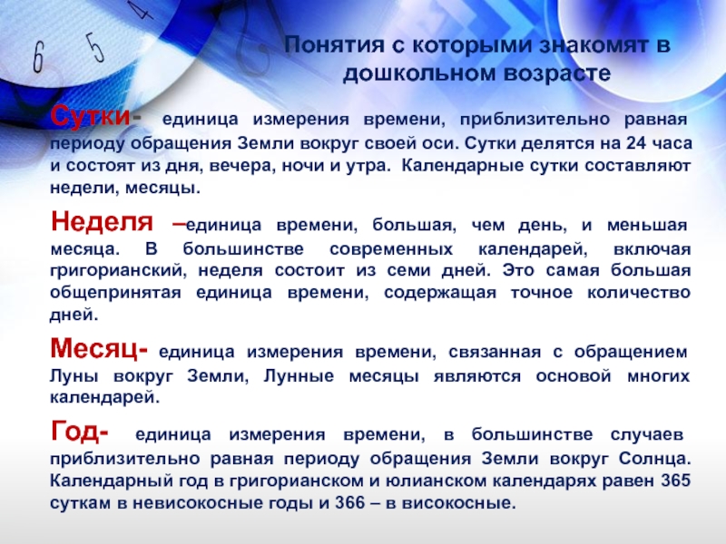 о времени. Детей знакомят с окружающим миром, в котором все события протекают во времени.