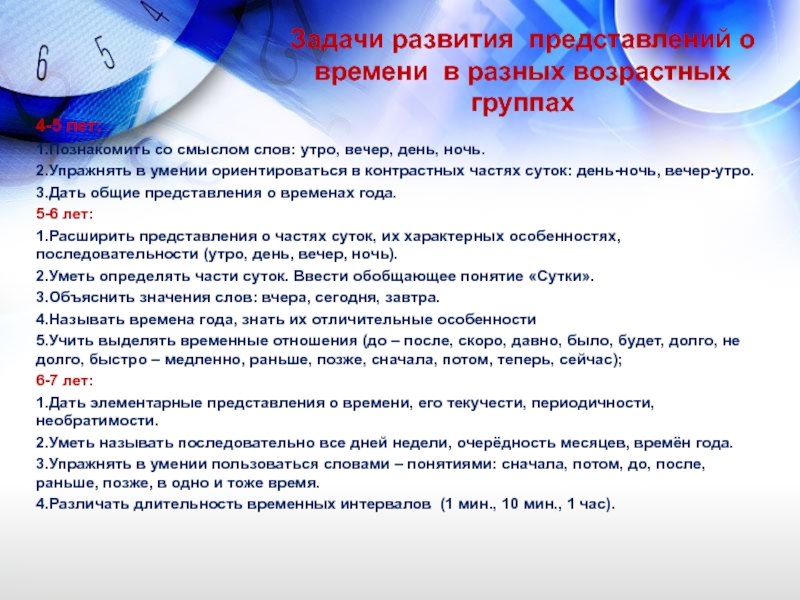 Слайд 13Задачи развития представлений о времени в разных возрастных группах