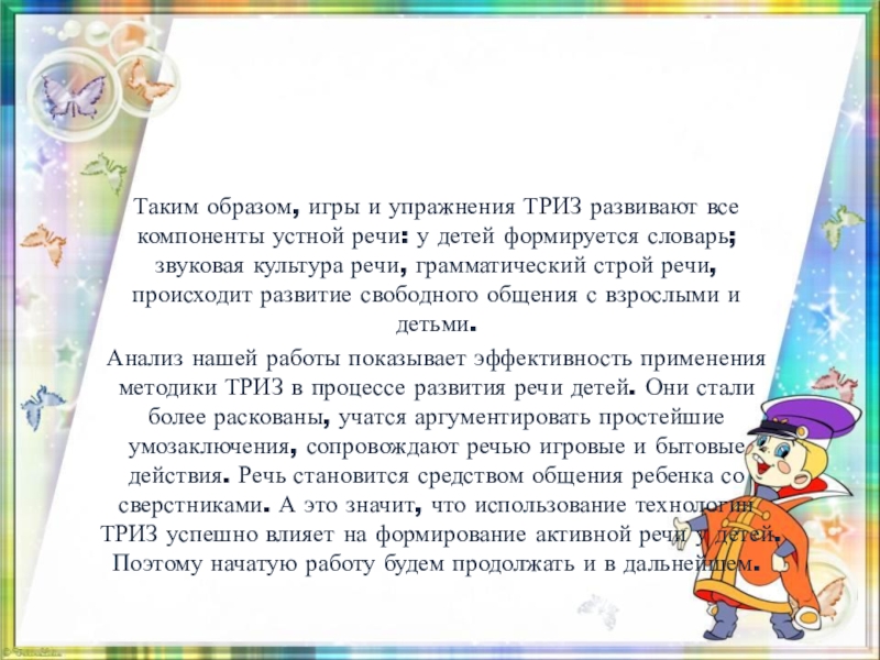 Анализ нашей работы показывает эффективность применения методики ТРИЗ в процессе развития речи детей. Они стали более раскованы, учатся аргументировать простейшие умозаключения, сопровождают речью игровые и бытовые действия. Речь становится средством общения ребенка со сверстниками. А это значит, что использование технологии ТРИЗ успешно влияет на формирование активной речи у детей. Поэтому начатую работу будем продолжать и в дальнейшем.