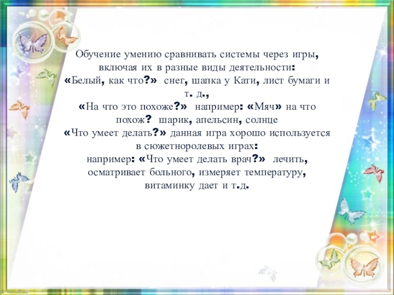 Слайд 8Обучение умению сравнивать системы через игры, включая их в разные виды