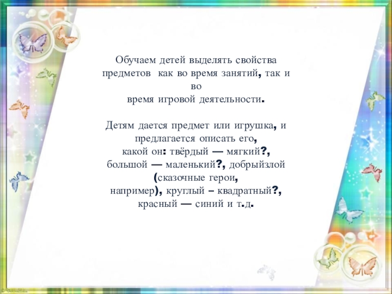 Слайд 7Обучаем детей выделять свойства предметов как во время занятий, так и