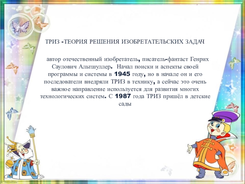 отечественный изобретатель, писатель-фантаст Генрих Саулович Альтшуллер. Начал поиски и аспекты своей программы и системы в 1945 году, но в начале он и его последователи внедряли ТРИЗ в технику, а сейчас это очень важное направление используется для развития многих технологических систем. С 1987 года ТРИЗ пришёл в детские сады