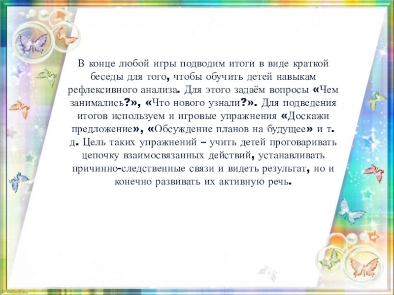 того, чтобы обучить детей навыкам рефлексивного анализа. Для этого задаём вопросы «Чем занимались?», «Что нового узнали?». Для подведения итогов используем и игровые упражнения «Доскажи предложение», «Обсуждение планов на будущее» и т.д. Цель таких упражнений – учить детей проговаривать цепочку взаимосвязанных действий, устанавливать причинно-следственные связи и видеть результат, но и конечно развивать их активную речь.