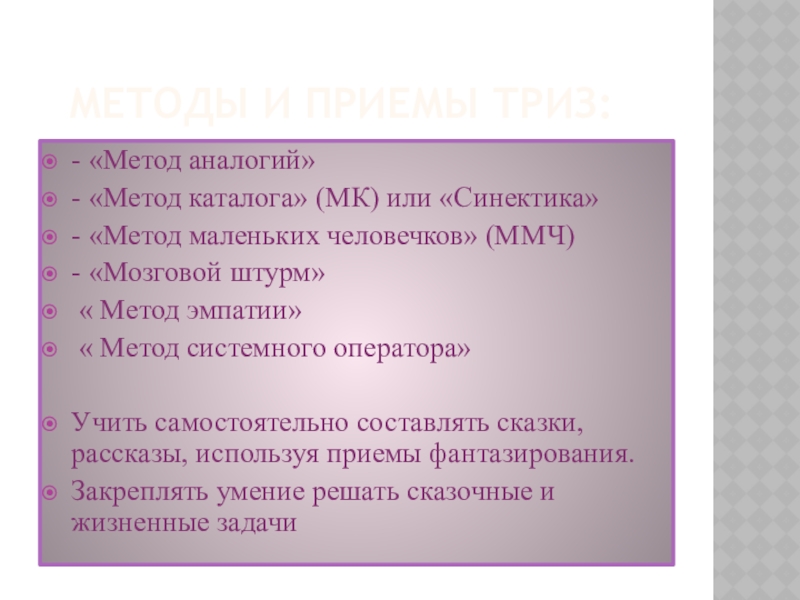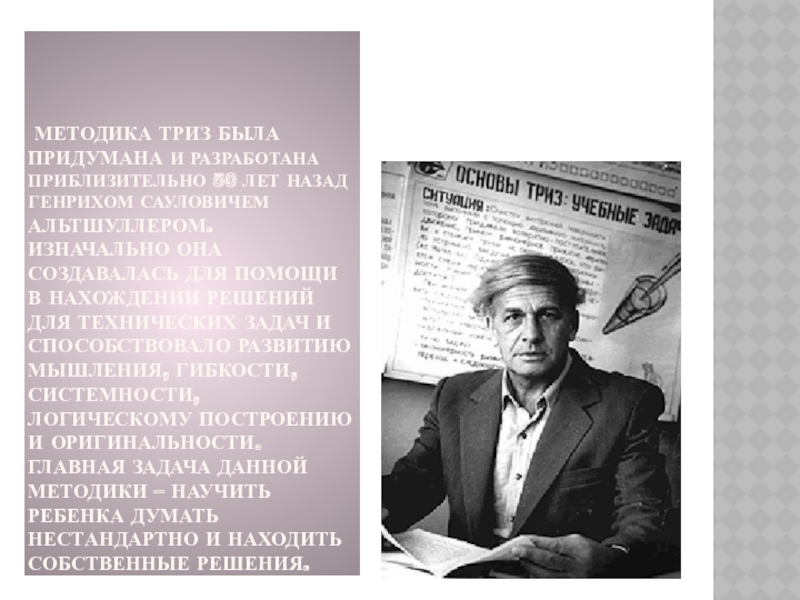 Генрихом Сауловичем Альтшуллером. Изначально она создавалась для помощи в нахождении решений для технических задач и способствовало развитию мышления, гибкости, системности, логическому построению и оригинальности. Главная задача данной методики – научить ребенка думать нестандартно и находить собственные решения.