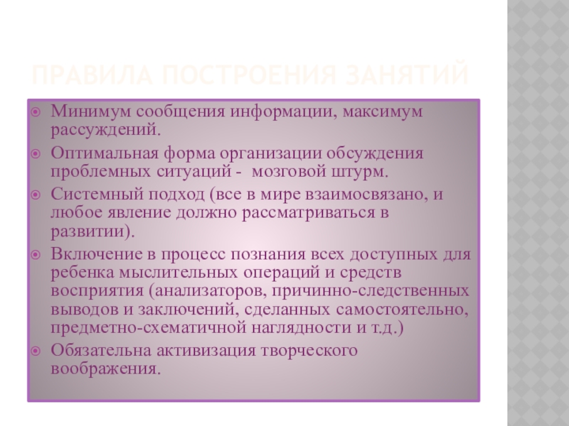 Включение в процесс познания всех доступных для ребенка мыслительных операций и средств восприятия (анализаторов, причинно-следственных выводов и заключений, сделанных самостоятельно, предметно-схематичной наглядности и т.д.)