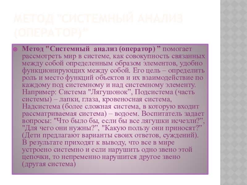 в системе, как совокупность связанных между собой определенным образом элементов, удобно функционирующих между собой. Его цель – определить роль и место функций объектов и их взаимодействие по каждому под системному и над системному элементу. Например: Система "Лягушонок”, Подсистема (часть системы) – лапки, глаза, кровеносная система, Надсистема (более сложная система, в которую входит рассматриваемая система) – водоем. Воспитатель задает вопросы: "Что было бы, если бы все лягушки исчезли?”, "Для чего они нужны?”, "Какую пользу они приносят?” (Дети предлагают варианты своих ответов, суждений). В результате приходят к выводу, что все в мире устроено системно и если нарушить одно звено этой цепочки, то непременно нарушится другое звено (другая система)