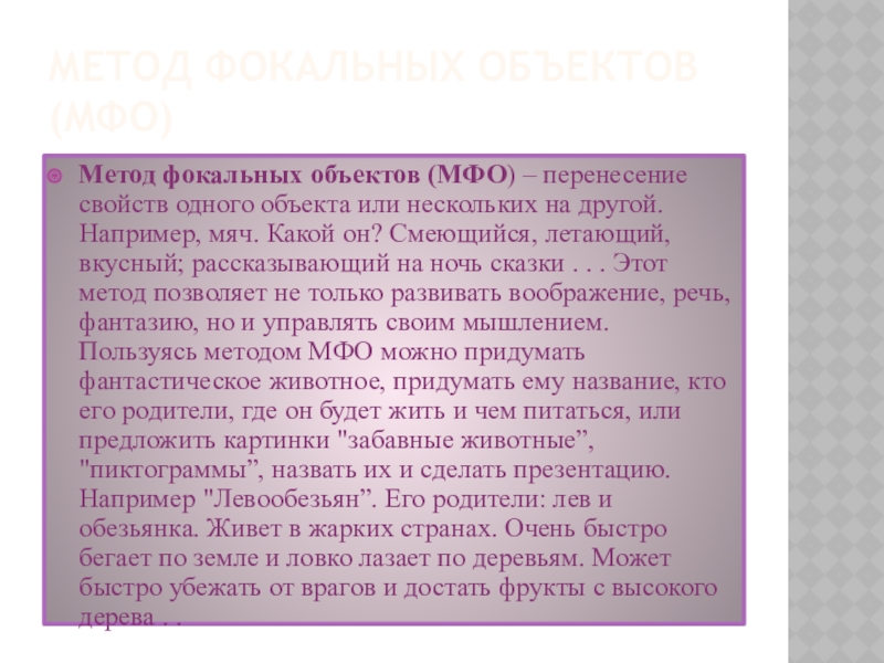 объекта или нескольких на другой. Например, мяч. Какой он? Смеющийся, летающий, вкусный; рассказывающий на ночь сказки . . . Этот метод позволяет не только развивать воображение, речь, фантазию, но и управлять своим мышлением. Пользуясь методом МФО можно придумать фантастическое животное, придумать ему название, кто его родители, где он будет жить и чем питаться, или предложить картинки "забавные животные”, "пиктограммы”, назвать их и сделать презентацию. Например "Левообезьян”. Его родители: лев и обезьянка. Живет в жарких странах. Очень быстро бегает по земле и ловко лазает по деревьям. Может быстро убежать от врагов и достать фрукты с высокого дерева . .