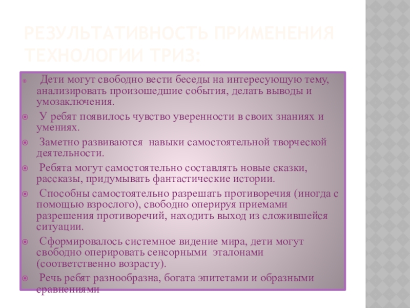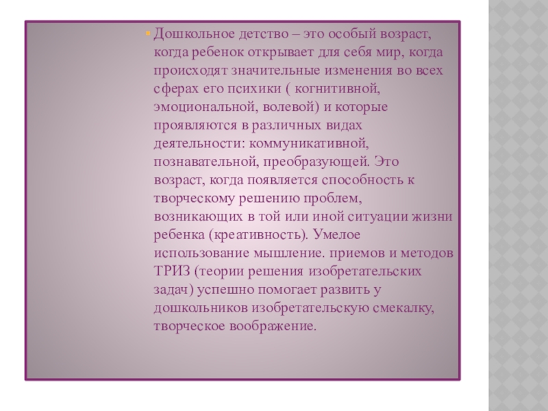 мир, когда происходят значительные изменения во всех сферах его психики ( когнитивной, эмоциональной, волевой) и которые проявляются в различных видах деятельности: коммуникативной, познавательной, преобразующей. Это возраст, когда появляется способность к творческому решению проблем, возникающих в той или иной ситуации жизни ребенка (креативность). Умелое использование мышление. приемов и методов ТРИЗ (теории решения изобретательских задач) успешно помогает развить у дошкольников изобретательскую смекалку, творческое воображение.
