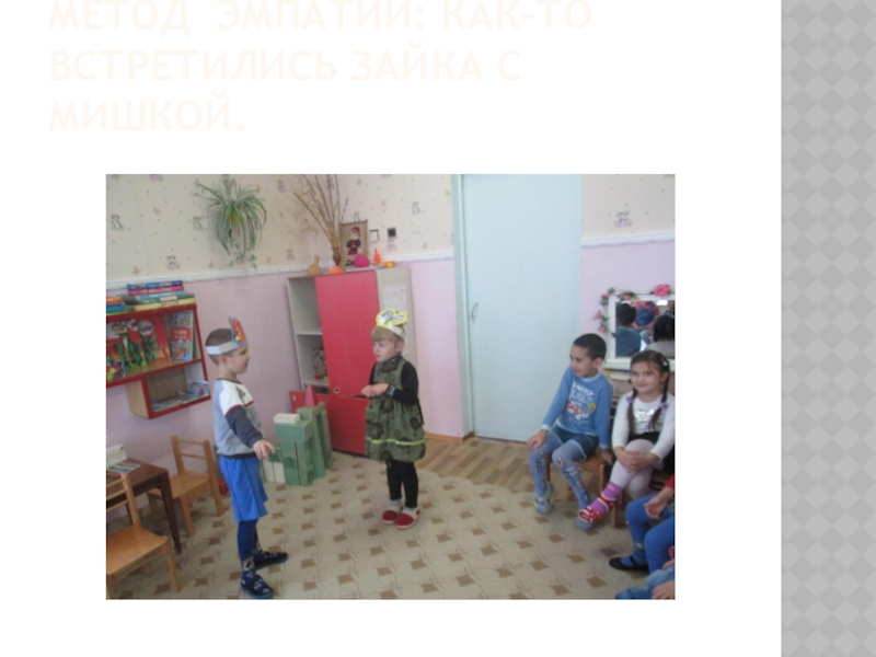 Слайд 19Метод эмпатии: как-то встретились зайка с мишкой.
