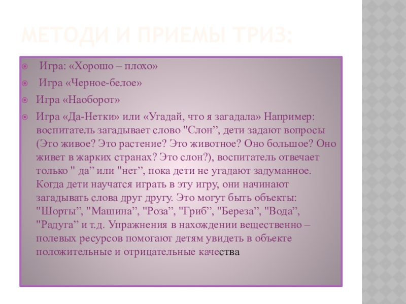 Игра «Да-Нетки» или «Угадай, что я загадала» Например: воспитатель загадывает слово "Слон”, дети задают вопросы (Это живое? Это растение? Это животное? Оно большое? Оно живет в жарких странах? Это слон?), воспитатель отвечает только " да” или "нет”, пока дети не угадают задуманное. Когда дети научатся играть в эту игру, они начинают загадывать слова друг другу. Это могут быть объекты: "Шорты”, "Машина”, "Роза”, "Гриб”, "Береза”, "Вода”, "Радуга” и т.д. Упражнения в нахождении вещественно – полевых ресурсов помогают детям увидеть в объекте положительные и отрицательные качества