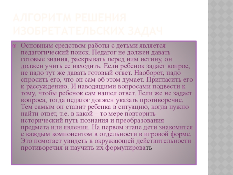 Педагог не должен давать готовые знания, раскрывать перед ним истину, он должен учить ее находить. Если ребенок задает вопрос, не надо тут же давать готовый ответ. Наоборот, надо спросить его, что он сам об этом думает. Пригласить его к рассуждению. И наводящими вопросами подвести к тому, чтобы ребенок сам нашел ответ. Если же не задает вопроса, тогда педагог должен указать противоречие. Тем самым он ставит ребенка в ситуацию, когда нужно найти ответ, т.е. в какой – то мере повторить исторический путь познания и преобразования предмета или явления. На первом этапе дети знакомятся с каждым компонентом в отдельности в игровой форме. Это помогает увидеть в окружающей действительности противоречия и научить их формулировать