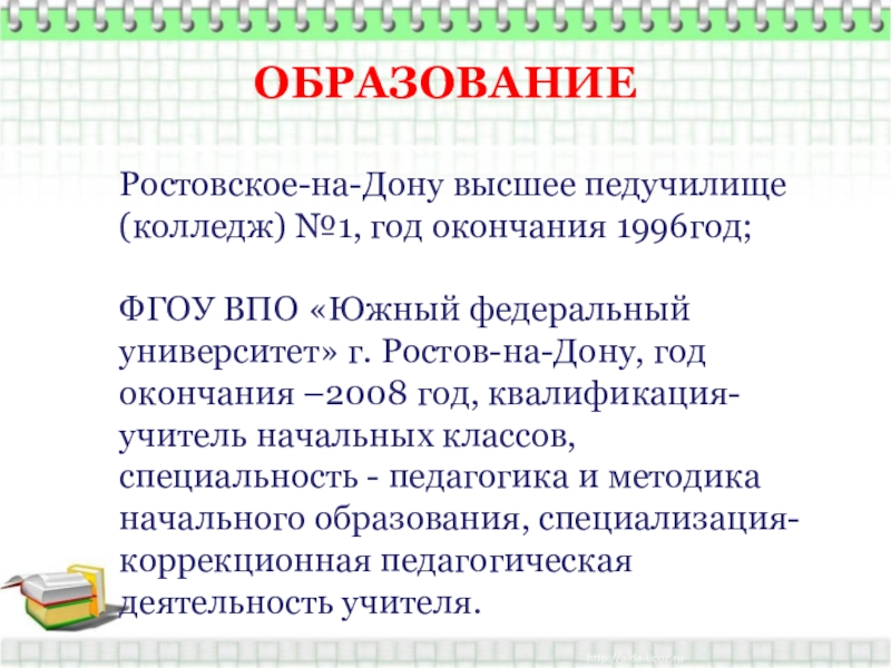 федеральный университет» г. Ростов-на-Дону, год окончания –2008 год, квалификация-учитель начальных классов, специальность - педагогика и методика начального образования, специализация- коррекционная педагогическая деятельность учителя.