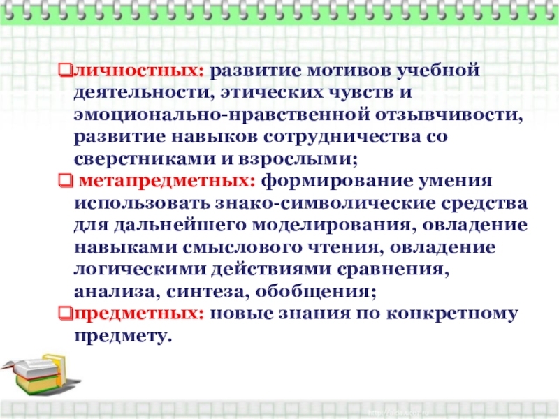 Слайд 7личностных: развитие мотивов учебной деятельности, этических чувств и эмоционально-нравственной отзывчивости, развитие