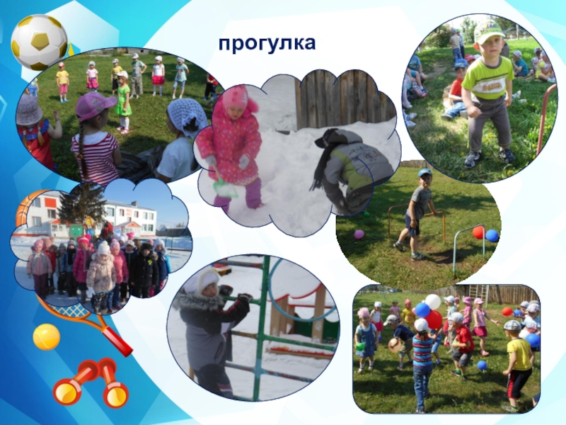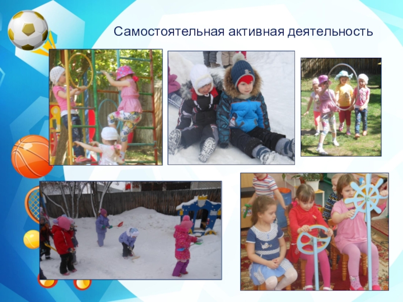 Для обеспечения достаточной двигательной активности детей широко используется оборудование физкультурного уголка группы, детской площадки и спортивного инвентаря