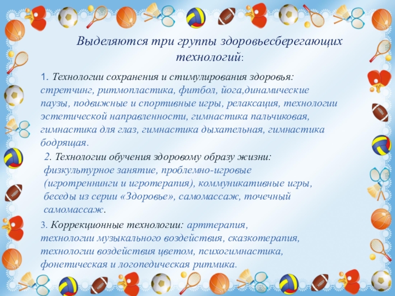 2. Технологии обучения здоровому образу жизни: физкультурное занятие, проблемно-игровые (игротреннинги и игротерапия), коммуникативные игры, беседы из серии «Здоровье», самомассаж, точечный самомассаж.