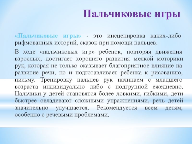 В ходе «пальчиковых игр» ребенок, повторяя движения взрослых, достигает хорошего развития мелкой моторики рук, которая не только оказывает благоприятное влияние на развитие речи, но и подготавливает ребенка к рисованию, письму. Тренировку пальцев рук начинаем с младшего возраста индивидуально либо с подгруппой ежедневно. Пальчики у детей становятся более ловкими, гибкими, дети быстрее овладевают сложными упражнениями, речь детей значительно улучшается. Рекомендуется всем детям, особенно с речевыми проблемами.