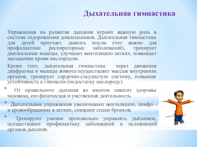 оздоровления дошкольников. Дыхательная гимнастика для детей приучает дышать носом (что важно для профилактики респираторных заболеваний), тренирует дыхательные мышцы, улучшает вентиляцию легких, повышает насыщение крови кислородом.