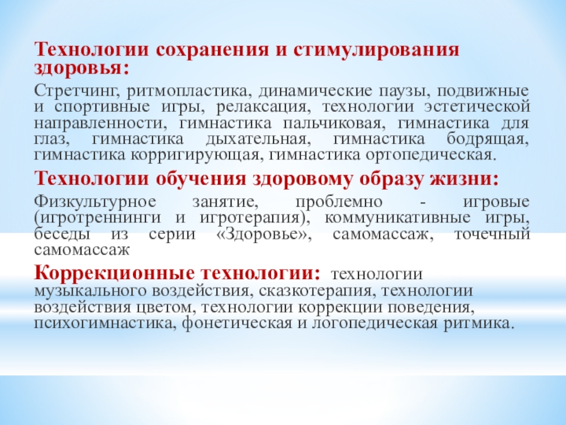 Коррекционные технологии: технологии музыкального воздействия, сказкотерапия, технологии воздействия цветом, технологии коррекции поведения, психогимнастика, фонетическая и логопедическая ритмика.