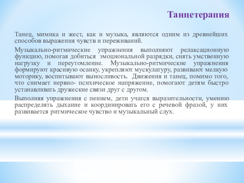 Музыкально-ритмические упражнения выполняют релаксационную функцию, помогая добиться эмоциональной разрядки, снять умственную нагрузку и переутомление. Музыкально-ритмические упражнения формируют красивую осанку, укрепляют мускулатуру, развивают мелкую моторику, воспитывают выносливость. Движения и танец, помимо того, что снимает нервно- психическое напряжение, помогают детям быстро устанавливать дружеские связи друг с другом.