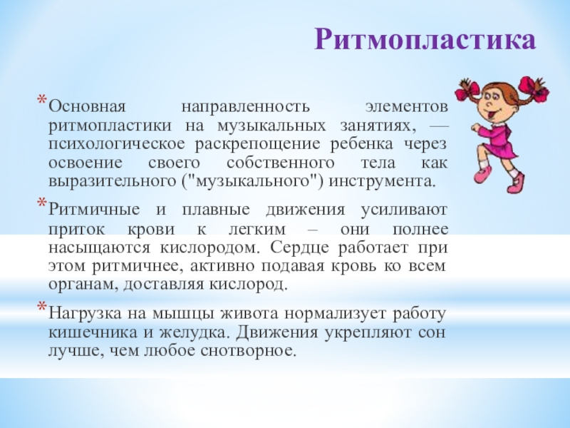 Основная направленность элементов ритмопластики на музыкальных занятиях, — психологическое раскрепощение ребенка