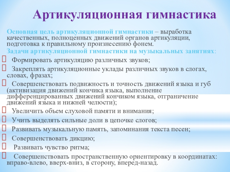 Задачи артикуляционной гимнастики на музыкальных занятиях: