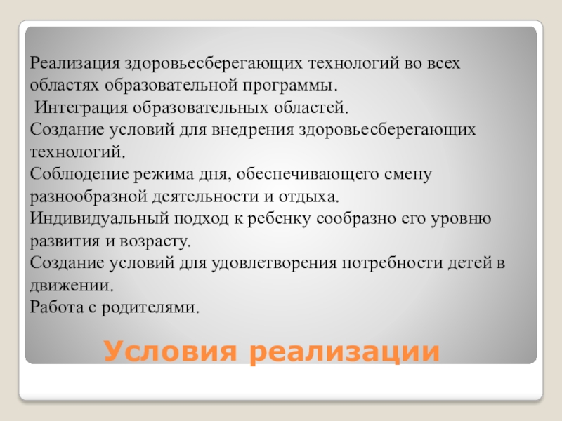 процесса воспитания и развития детей, основными из которых являются: построение образовательного процесса в соответствии с СанПинами; организация разумного двигательного режима; организация разных видов деятельности детей в игровой форме ; оснащение деятельности детей оборудованием, игрушками, играми, игровыми упражнениями и пособиями для двигательной активности, имеются картотеки по здоровьесберегающим технологиям(пальчиковой и дыхательной гимнастик, подвижных игр). Работа осуществляется в течение всего дня.
