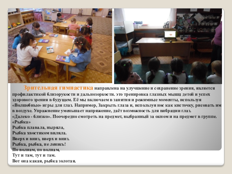Слайд 13Зрительная гимнастика направлена на улучшение и сохранение зрения, является профилактикой близорукости