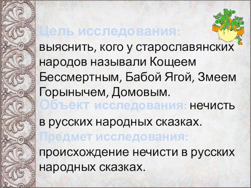 Предмет исследования: происхождение нечисти в русских народных сказках.