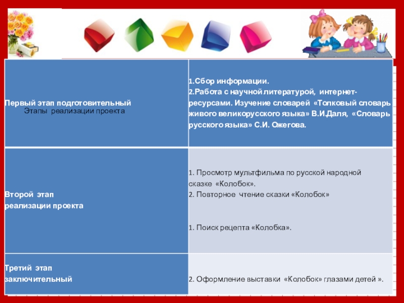 - С помощью словаря узнали точное значение малопонятных нам до этого слов; - С помощью интернет-ресурсов мы восстановили рецепт «Колобка» и попробовали его испечь дома с родителями.