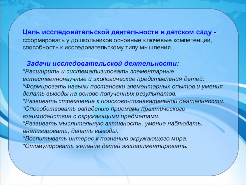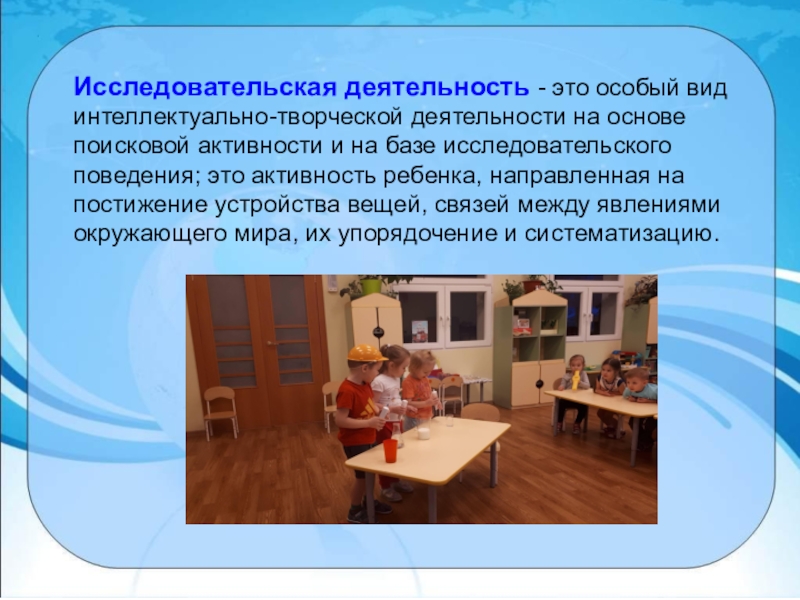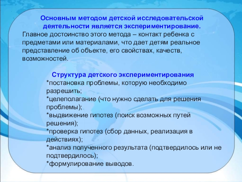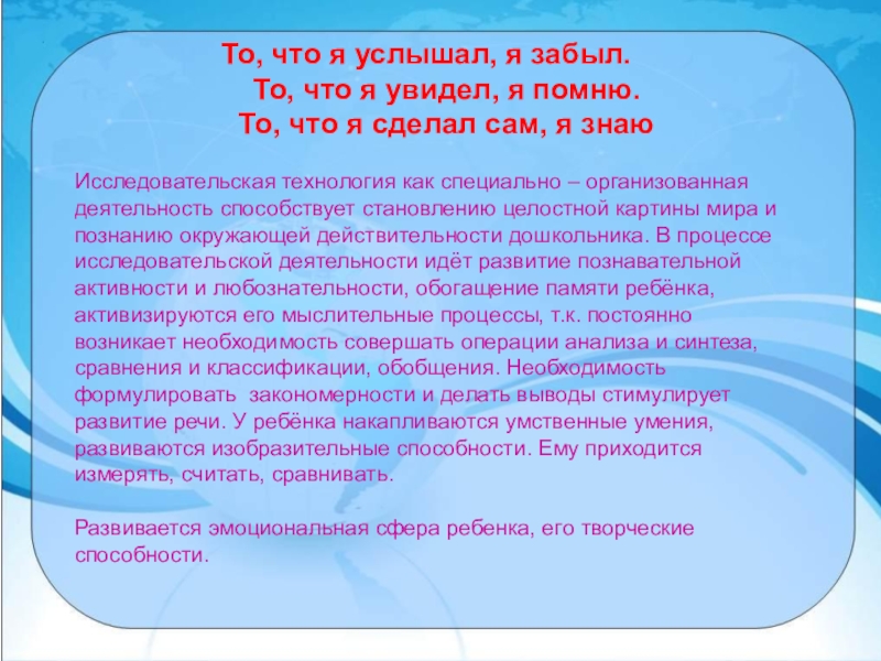 Исследовательская технология как специально – организованная деятельность способствует становлению целостной картины мира и познанию окружающей действительности дошкольника. В процессе исследовательской деятельности идёт развитие познавательной активности и любознательности, обогащение памяти ребёнка, активизируются его мыслительные процессы, т.к. постоянно возникает необходимость совершать операции анализа и синтеза, сравнения и классификации, обобщения. Необходимость формулировать закономерности и делать выводы стимулирует развитие речи. У ребёнка накапливаются умственные умения, развиваются изобразительные способности. Ему приходится измерять, считать, сравнивать.