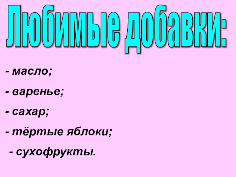 Любимые добавки: масло; варенье; сахар; тёртые яблоки;- сухофрукты.