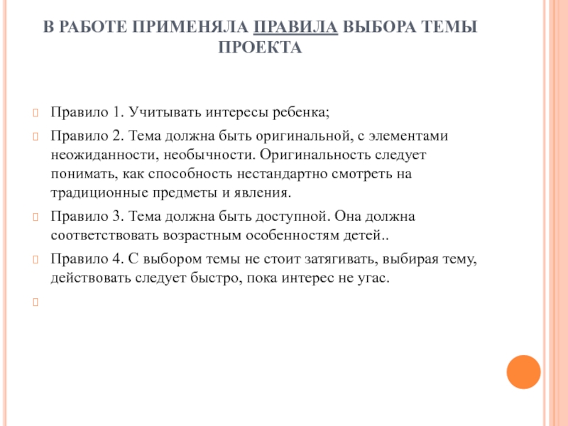 Слайд 8В РАБОТЕ ПРИМЕНЯЛА ПРАВИЛА ВЫБОРА ТЕМЫ ПРОЕКТА