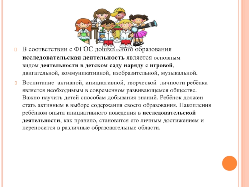 Воспитание активной, инициативной, творческой личности ребёнка является необходимым в современном развивающемся обществе. Важно научить детей способам добывания знаний. Ребёнок должен стать активным в выборе содержания своего образования. Накопления ребёнком опыта инициативного поведения в исследовательской деятельности, как правило, становится его личным достижением и переносится в различные образовательные области.