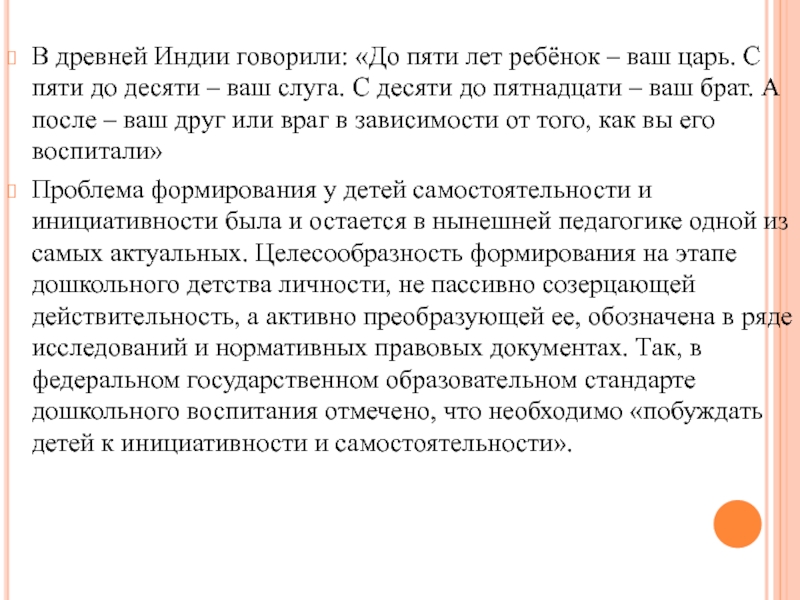 Проблема формирования у детей самостоятельности и инициативности была и остается в нынешней педагогике одной из самых актуальных. Целесообразность формирования на этапе дошкольного детства личности, не пассивно созерцающей действительность, а активно преобразующей ее, обозначена в ряде исследований и нормативных правовых документах. Так, в федеральном государственном образовательном стандарте дошкольного воспитания отмечено, что необходимо «побуждать детей к инициативности и самостоятельности».